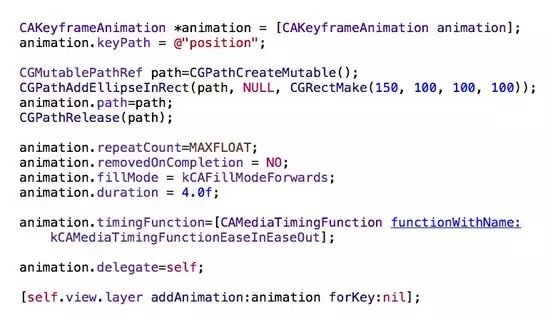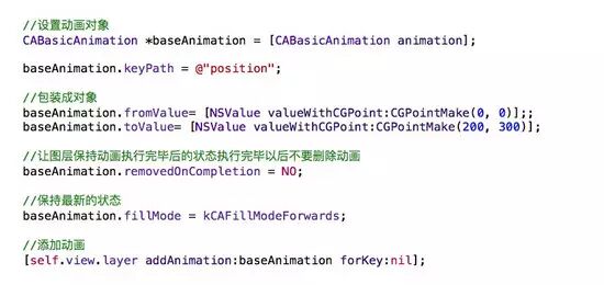 3.通过调用CALayer的addAnimation:forKey:方法增加CAAnimation对象到CALayer中,这样就能开始执行动画了;
