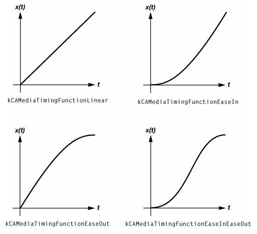 4) kCAMediaTimingFunctionEaseInEaseOut(渐进渐出):动画缓慢的进入,中间加速,然后减速的到达目的地。这个是默认的动画行为。