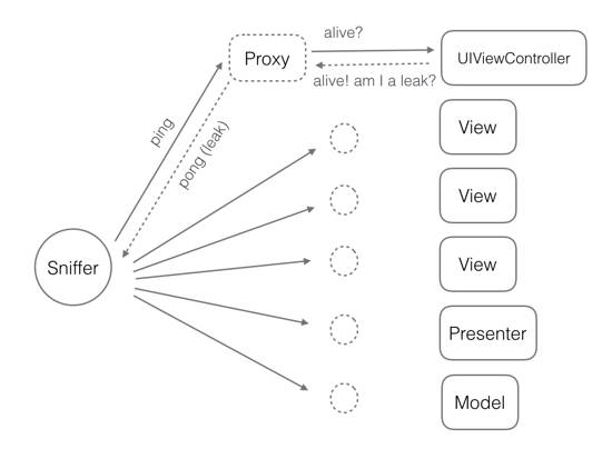 PLeakSniffer采取保守的策略,通过Objective C的runtime机制,递归的将一个Controller所有强引用的property找出,并安装proxy监听Ping通知。在我的测试下,基本上能将property泄漏的场景找出。