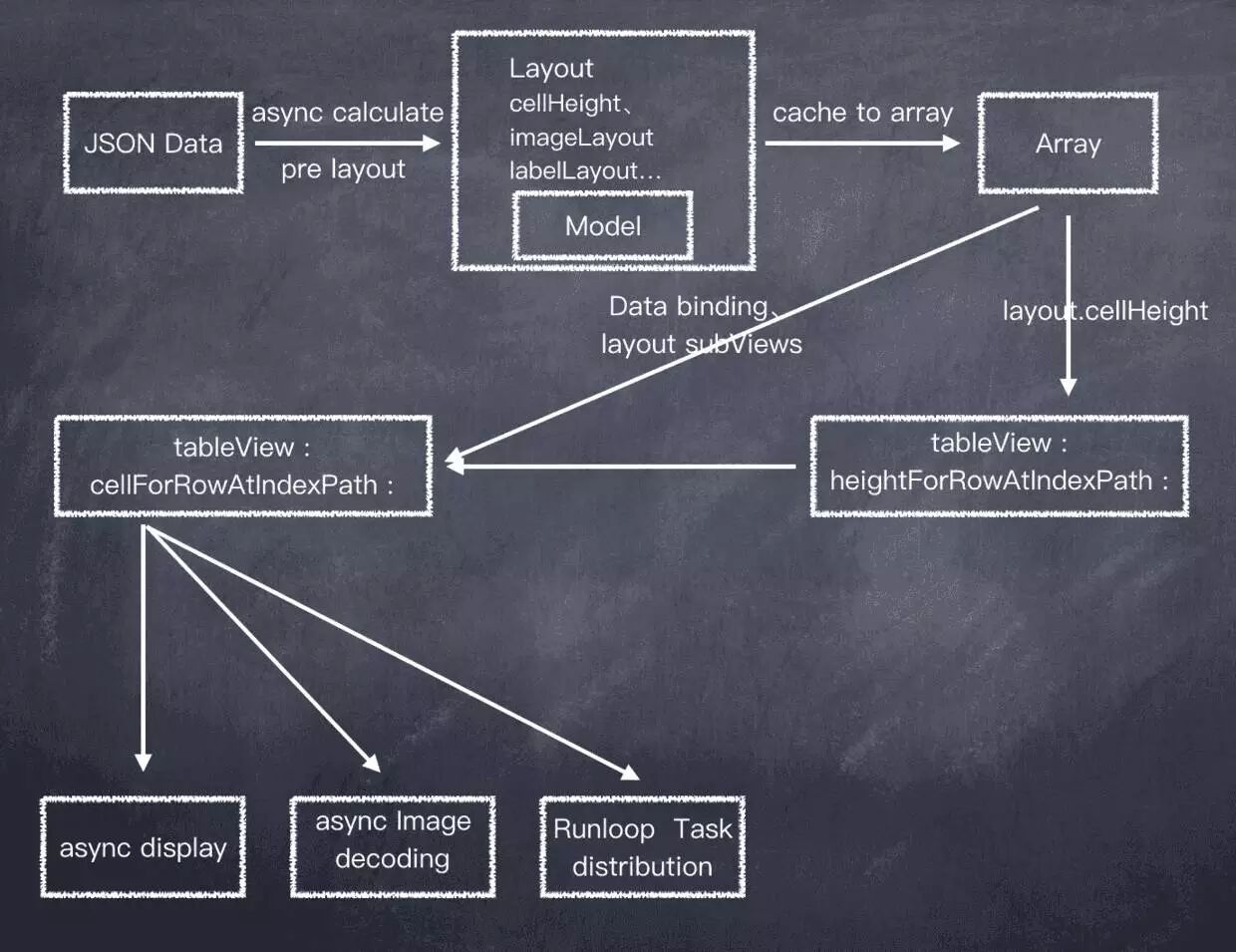从图中简单看下流程,从网络请求返回JSON数据,将Cell的高度以及内部视图的布局封装为Layout对象,Cell显示之前在异步线程计算好所有布局对象,并存入数组,每次调用tableView: heightForRowAtIndexPath :只需要从数组中取出,可避免重复的布局计算。同时在调用tableView: cellForRowAtIndexPath :对Cell内部视图异步绘制布局,以及图片的异步绘制解码,这里就要说到今天的主角YYAsyncLayer。