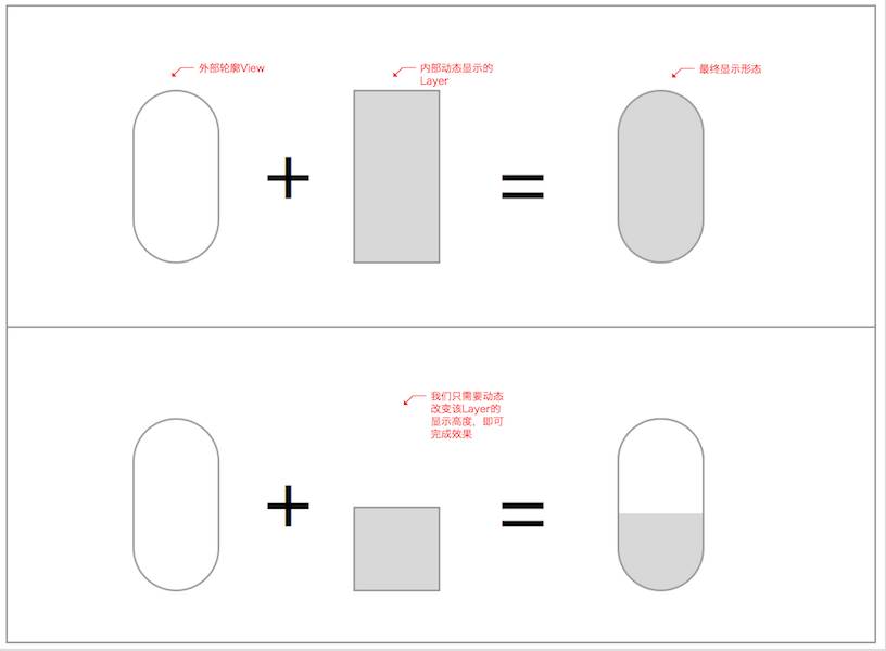外部轮廓View主要控制显示大小和显示的圆角效果。内部的Layer主要控制动态显示的高度,虽然他是矩形的。但是当把该Layer加入到View中,而该View设置了_dynamicView.clipsToBounds = YES;。内部的Layer超过外部轮廓的部分,则会被切除掉。