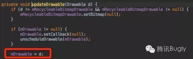 setImageDrawable(Drawable d) 中调用 updateDrawable(Drawable d),而mDrawable 正是在updateDrawable(Drawable d)中赋值的: