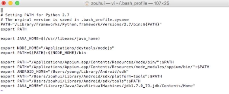 将双击安装包appium.dmg,或将它拖动到Applications文件夹即完成安装。设置Appium环境变量,将appium.js和appium-doctor.js文件所在路径配置到PATH环境变量设置参考,如图3.2所示。
