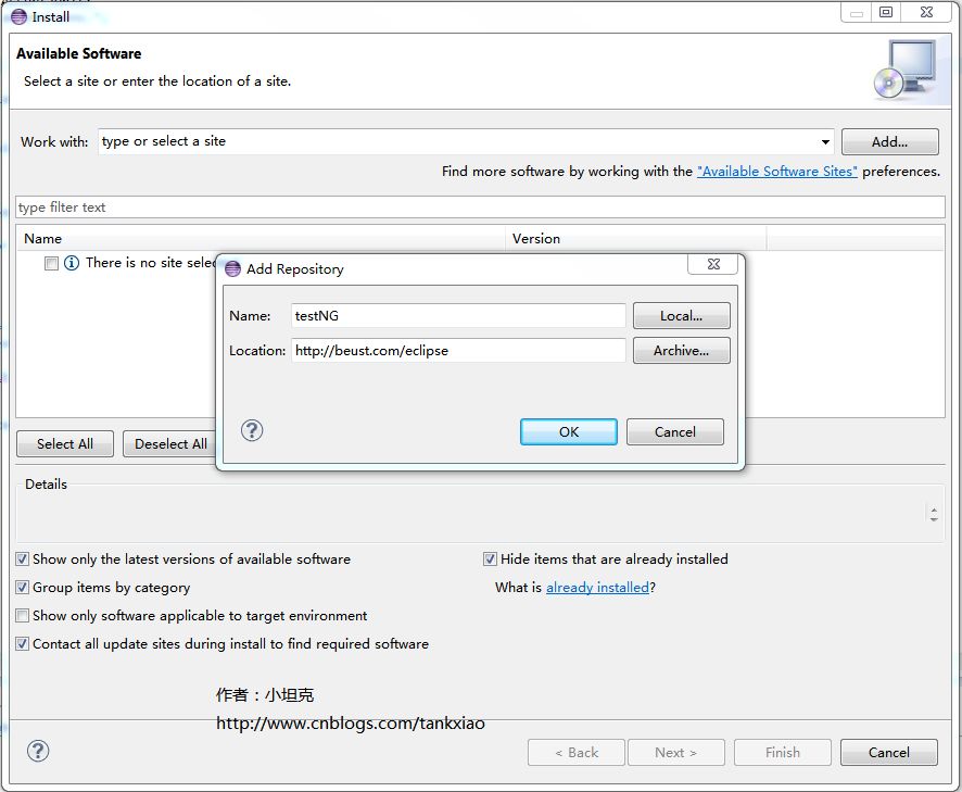 打开Eclipse Help ->Install New Software , 然后Add "http://beust.com/eclipse"