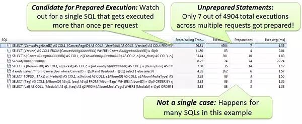 数据库访问框架通常在这一点上做得很出色,会对查询语句进行预处理。但在自定义代码中,我发现开发者经常会忽略这一点。在以下示例中,只有一小部分SQL执行经过了预处理过程: