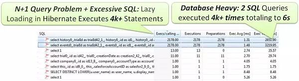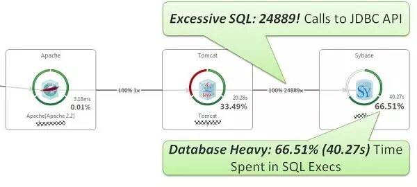 从这个屏幕上我们可以立即发现造成问题的头两种模式,即过多的SQL执行模式以及数据库繁忙模式。让我们来分析一下: