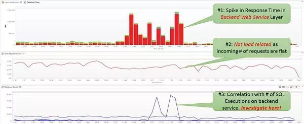 我们同时可以发现,该Web Service并没有承受异常的负载,因为从第二张图来看,当时应用程序所处理的请求数量这条线比较平稳。一般情况下,整体响应时间多数都耗费在数据层,但这并不代表数据库本身的速度缓慢!我了解,低效的数据库访问往往是造成性能不佳的主要原因,因此通常会结合分析SQL语句的执行次数。在这个示例中,已经能够很清楚地看到它与大多数响应时间的峰值是相关的。