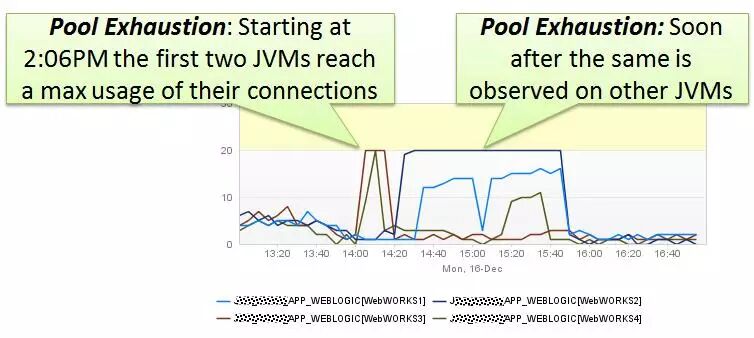 通过JMX指标信息,能够方便地对连接池的使用情况进行监控。每种应用服务器(Tomcat、JBoss、Websphere等等)都会提供这些指标,不过有些服务器需要你明确地开启这种特性。下图展示了某个群集中的WebLogic服务器的连接池使用情况。你可以看到,在其中三台应用服务器中,“活动的DB连接数量”都已经达到最大值。