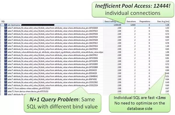 如果我们对个别的SQL语句进行分析,将发现这个请求还有另外的问题,即N+1 次查询问题以及低效的连接池访问(下文将进行详细讨论):