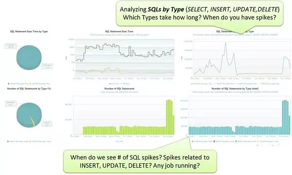示例4表现了某个后台报表应用在每天下午2点执行所造成的问题,与之类似,我同样也会关注SQL访问随着时间变化的模式。我所关注的不仅包括总执行时间,同时也包括SELECT、INSERT、UPDATE与DELETE的执行次数。这样一来,我就能够指出是否在某个时间段内会进行一些特别的活动,例如通过后台作业对大批数据进行更新。
