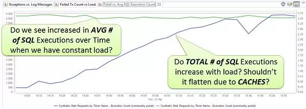 下面这张图表展示了SQL语句执行的平均次数(绿色)以及SQL语句执行的总次数(蓝色)。我们为应用进行了一次两小时的性能测试,保持负载始终处于较高水平。我所期望的结果是平均次数逐渐减少,而总次数则趋向平稳。因为按照我的假设,从DB所获取的数据大多数是静态的,或是会被缓存在某个不同的层。