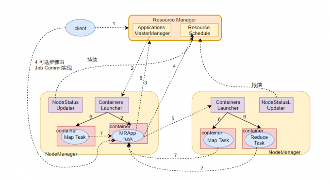 - ApplicationMaster首先向ResourceManager注册,这样用户可以直接通过RM查看程序的运行状态。然后它将为各个任务申请资源,并监控他的运行状态,知道运行结束,重复4~7;
