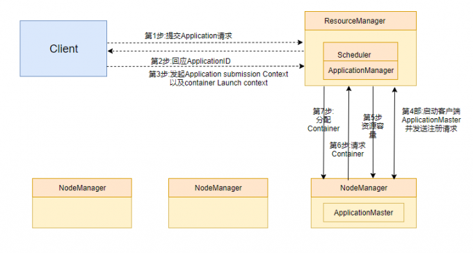 首先,客户端通知ResourceManager它要提交一个应用程序。随后ResourceManager在应答中返回一个ApplicationId以及必要的客户端请求资源的集群容量信息,资源请求分为两步:1.提交Application请求 2.返回ApplicationID。