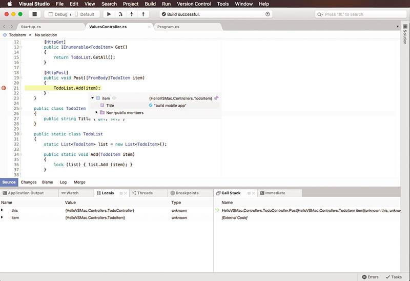 这会触发调试器中的断点。可以检查自动从请求的 JSON 主体解析并转换为 ToDoItem 对象的值。你会看到 Visual Studio for Mac 自动进入调试布局,并提供了所期望的所有调试器面板: 堆栈、局部、线程、断点等等。