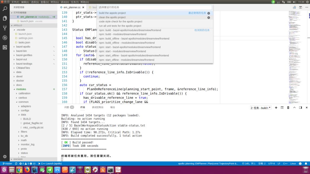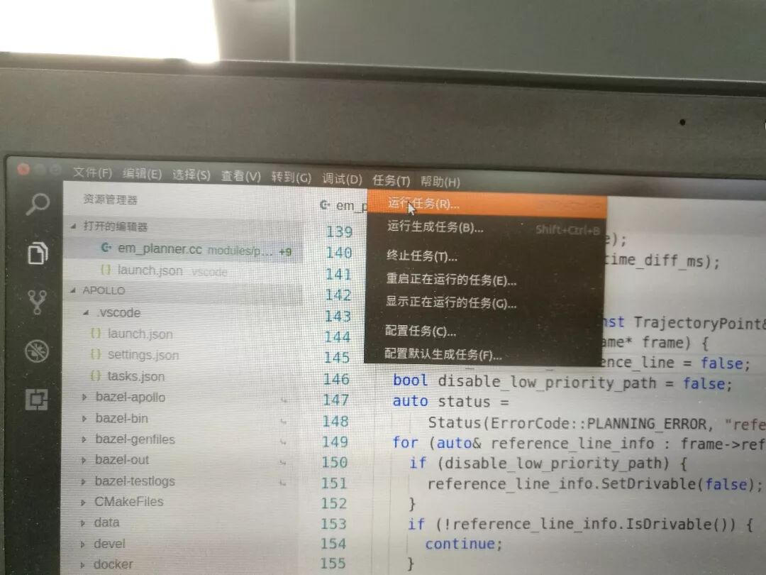 执行VSCode的菜单命令:任务->运行任务(R)…,在弹出的窗口中,选择 “clean the apollo project”(清理Apollo项目)。待清理完毕后,按快捷键“Ctrl+Shift+B”,重新构建Apollo项目。