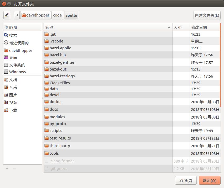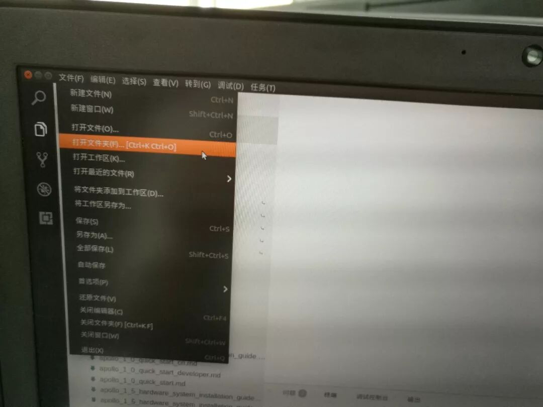 1.1编译方法打开“Visual Studio Code”,执行菜单命令“文件->打开文件夹”,在弹出的对话框中,选择“Apollo”项目源文件夹,点击“确定”,如下图所示: