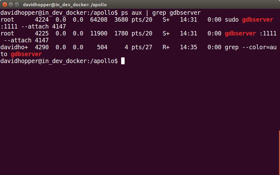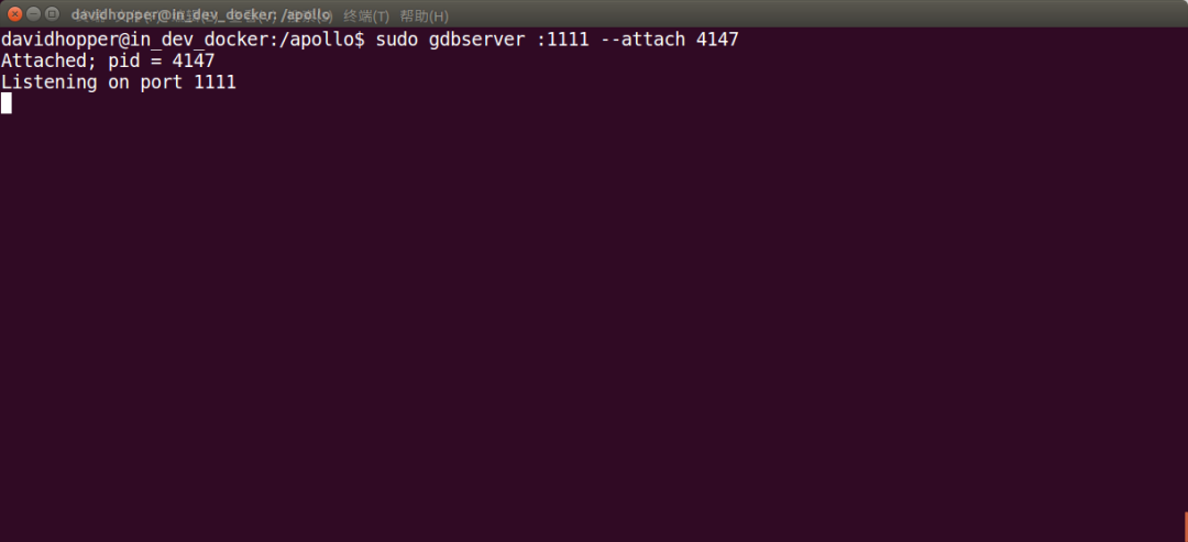 则表示Docker内部已安装了GDBServer(我已请Apollo项目组老师将GDBServer预装至Docker内部,正常情况下应该能看到上述提示信息)。若提示如下信息: