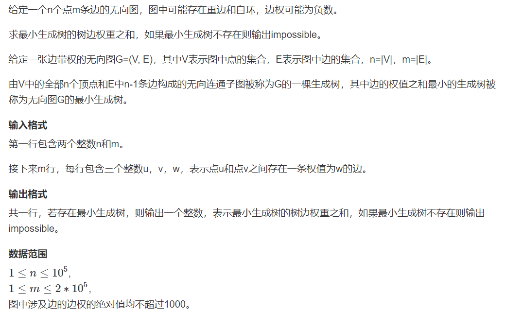 1 #include <bits/stdc++.h> 2 using namespace std; 3 const int N = 200010; 4 struct edge { 5 int a, b, w; 6 friend bool operator < (edge e1, edge e2) { 7 return e1.w < e2.w; 8 } 9 } edges[N]; 10 int n, m; 11 int p[N]; //并查集里面的p 12 int find(int x) { 13 if (p[x] != x) { 14 p[x] = find(p[x]); 15 } 16 return p[x]; 17 } 18 int main() { 19 cin >> n >> m; 20 for (int i = 0; i < m; i++) { 21 int a, b, w; 22 cin >> a >> b >> w; 23 edges[i].a = a; 24 edges[i].b = b; 25 edges[i].w = w; 26 } 27 sort(edges, edges + m); //1.将所有边按照权重从小到大排序 28 for (int i = 1; i <= n; i++) { //初始化并查集 29 p[i] = i; 30 } 31 int res = 0, cnt = 0; 32 //权重之和,边的数量 33 for (int i = 0; i < m; i++) { //2.从小到大枚举每条边 34 int a = edges[i].a, b = edges[i].b, w = edges[i].w; 35 a = find(a), b = find(b); 36 if (a != b) { //并查集,如果不连通 37 p[a] = b; //加进来 38 res += w; 39 cnt++; 40 } 41 } 42 if (cnt < n - 1) { //不连通 43 cout << "impossible" << endl; 44 } else { 45 cout << res << endl; 46 } 47 return 0; 48 }