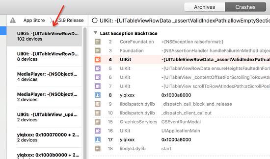 在崩溃信息这一栏苹果会按照崩溃数量排序,将崩溃数量最多的排在最前。右侧的详细信息会显示是崩溃时的调用堆栈,可以看到是哪行代码导致的崩溃。