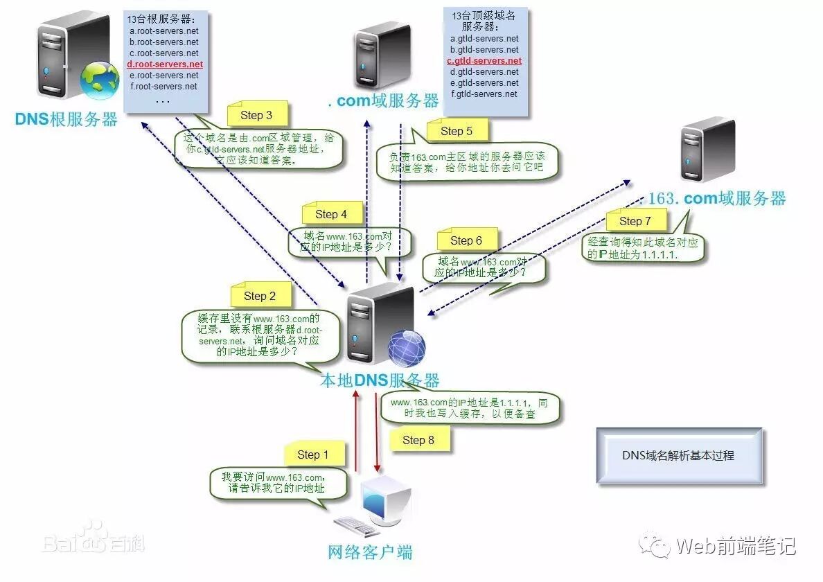 (4)、根DNS服务器没有记录具体的域名和IP地址的对应关系,而是告诉本地DNS服务器,你可以到域服务器上去继续查询,并给出域服务器的地址,这个过程是迭代的过程。