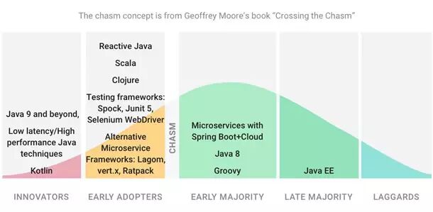作为InfoQ下一年编辑关注点审核工作的一部分,我们挑选了Java作为深入探讨的主题。我们借用了Geoffrey Moore在他的经典书籍《跨越鸿沟》里的所描述的模型,这个模型贴切地概括了技术的生命周期,它包含五个阶段:创新者(Innovators)、早期采用者(Early Adopters)、早期大众(Early Majority)、后期大众(Late Majority)和落后者(Laggards)。Moore的模型在早期采用者和早期大众两个阶段之间引入了一个大缺口,早期采用者是真正愿意冒着风险使用新技术的人,而早期大众在确认新技术能够提升生产效率之前是不会采取行动的。