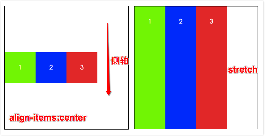 下面demo只展示center和stretch的栗子,其他几个可以参考flex-start和flex-end那样。