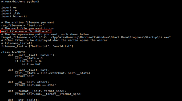 将exp.py中的evil_filename = “calc.exe”改为”WinRAR.exe”