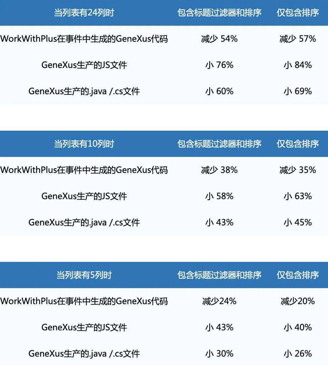 此次更新,对列表对象进行了很大的优化,在大多情况下,能够将生成的.cs/.java文件和js文件中的代码减少50%以上。在针对列表的标题过滤器和排序的实现方式上,WorkWithPlus 13.15将这些用户控件统一到一个中,大大减少了表单中添加的用户控件的数量,从而减少了生成的代码文件(.cs、.java、js)的大小,会直接提高对应WebPanel的编译效率和执行性能。