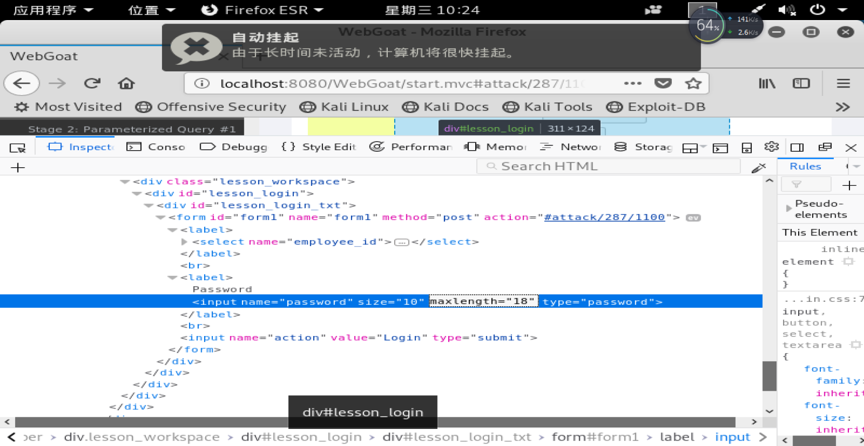 3.目标:利用查询的脆弱性创建触发器。由于 WebGoat 使用的是 MySQL 数据库,不支持触发器,所以该课程不会真正完成。 我们的 Login ID 是 101。