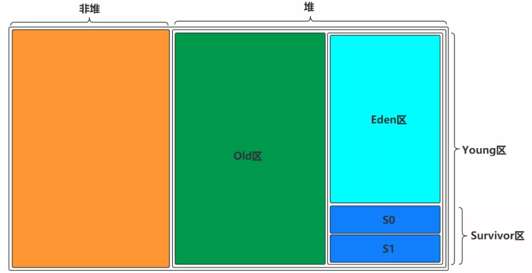 Young区分为两大块,一个是Survivor区(S0+S1),一块是Eden区。Eden:S0:S1=8:1:1