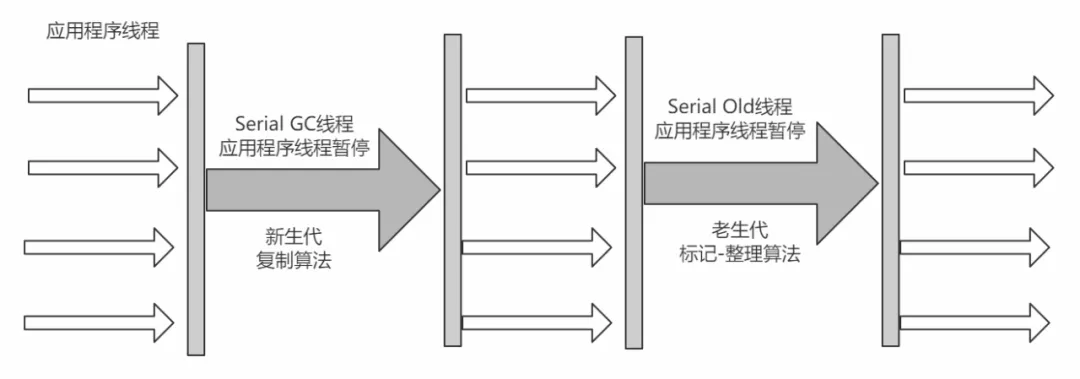 它是一种单线程收集器,不仅仅意味着它只会使用一个CPU或者一条收集线程去完成垃圾收集工作,更重要的是其在进行垃圾收集的时候需要暂停其他线程。