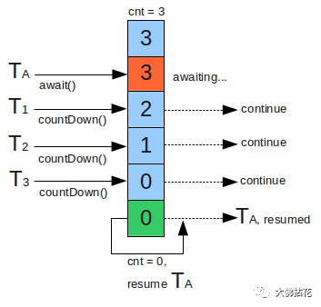 上图是countDownLatch的原理示意图。官方文档给出的解释是:CountDownLatch是一个同步工具类,它允许一个或多个线程一直等待,直到其他线程执行完后再执行。上图中线程A调用方法await()之后,进行阻塞,然后线程1执行任务完毕,数量减1,到最后线程2、3执行完毕,count=0。那么此时线程A等待了所有的线程执行完毕了任务。线程A状态复位,开始继续执行任务。