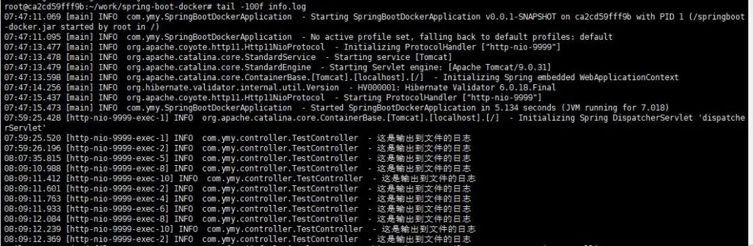这说明我们已经springboot项目已经启动成功了,到这里docker部署springboot项目差不就结束了,但是你可能还有一个疑问,如果我想看控制台的日志怎么办呢?像我们一般使用java -jar的时候都会生成一个控制台的日志文件,那docker容器中怎么查看控制台日志呢?其实很简单,只需要一行命令即可