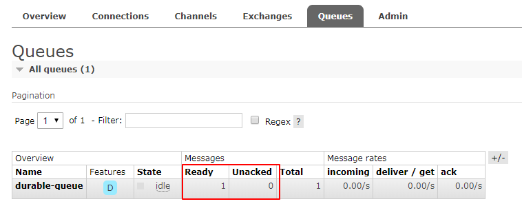 - 已经投递给消费者,但是还没有收到消费者确认信号的消息(下图中的Unacked部分)