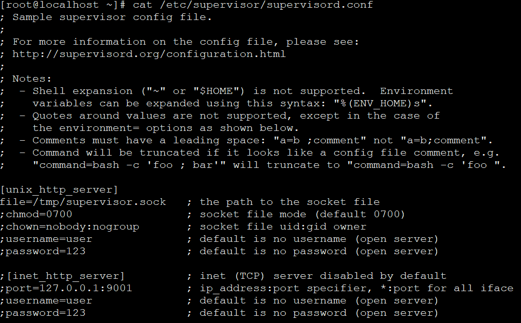 [root@localhost ~]# mkdir /etc/supervisor/ [root@localhost ~]# echo_supervisord _conf > /etc/supervisor/supervisord.conf -- 生成一个比较全面的示例文件,稍加修改就可以使用。