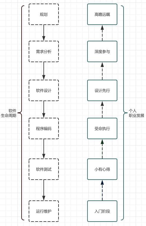打住,现在来想一想自己的从业经历是一个什么样的过程。仔细想想还真是跟软件生命周期很像,差别在于两者不是一个正匹配的过程,而是反向的。摸清楚这样一个规律,我们发展的轨迹就不会那么模糊不清。按图索骥,回顾我们目前所在的位置,在对比生命周期的阶段,相信就会找到方向。特别是你在迷茫徘徊时。