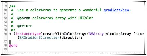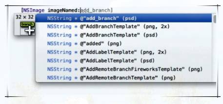 也是非常残暴的一个功能,在开发中我们的图片名称都是fb_poinum_high类似的,用这个插件敲出前缀就能够看到对应的一批图片缩略图再上下选择非常方便。 不足之处也有,那就是已经敲完的代码想看到图片缩略图必须先把imageNamed删掉 再重新敲一次才能看到缩略图,如果在@"fb_poinum_high" 图片名中一修改就能看到图片列表就更好了。