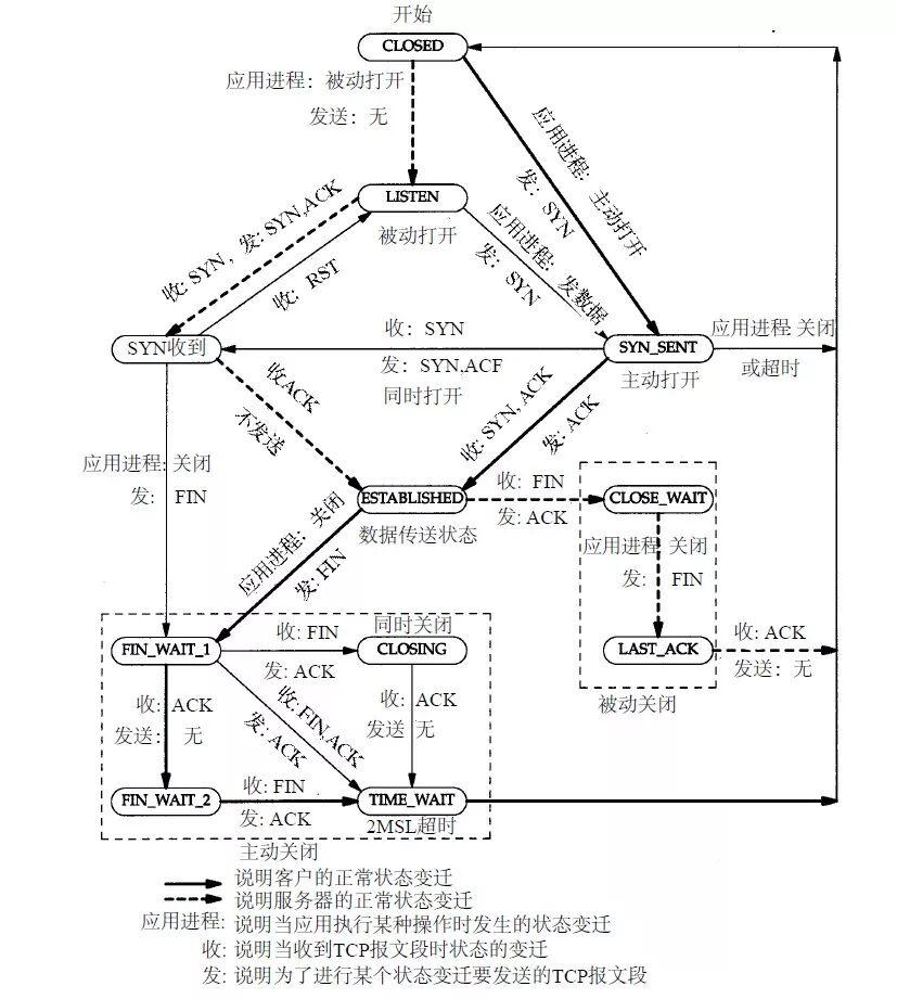 《TCP/IP详解 卷1:协议》有一张TCP状态变迁图,很具有代表性,有助于大家理解三次握手和四次挥手的状态变化。如下图所示,粗的实线箭头表示正常的客户端状态变迁,粗的虚线箭头表示正常的服务器状态变迁。