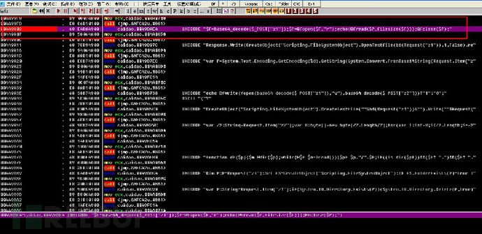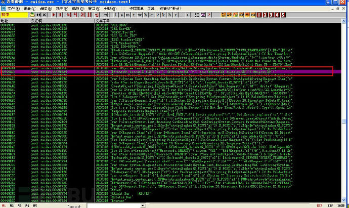 可知,程序时将其作为字符串,压入栈中作为参数被后续函数处理的,如果在这段字符串后加入我们的后门代码,就会被程序一块发送到服务端执行。