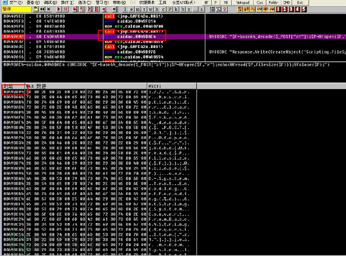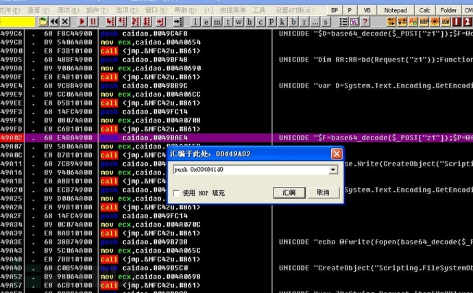 用OD打开菜刀程序,定位到第4步中字符串入栈的代码处 push 0049bae4。