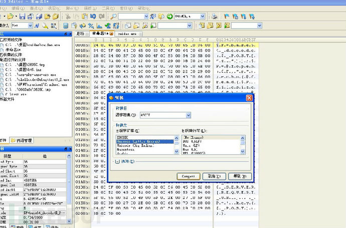 由于程序中的字符串是双字节存放的,这里我们需要将后门代码也转化为双字节的。010ditor-工具-转换