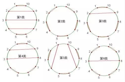 5、在圆上选择2n个点,将这些点成对链接起来使得所得到的n条线段不相交,一共有多少种方法?(下图供参考)