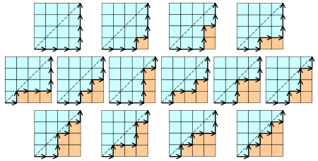 6、n*n的方格地图中,从一个角到另外一个角,不跨越对角线的路径数为h(n).例如, 4×4方格地图中的路径有: