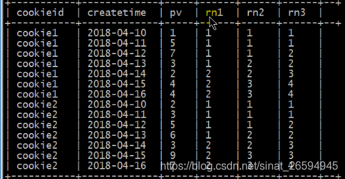 select cookied,createtime,pv row_number() over(partition by cookieid order by pv desc) as rn from message;