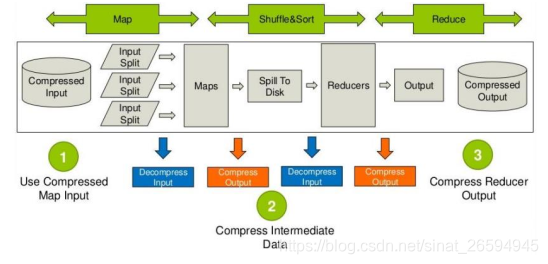 需要分析处理的数据在进入map前可以压缩,然后解压处理,map处理完成后的输出可以压缩,这样可以减