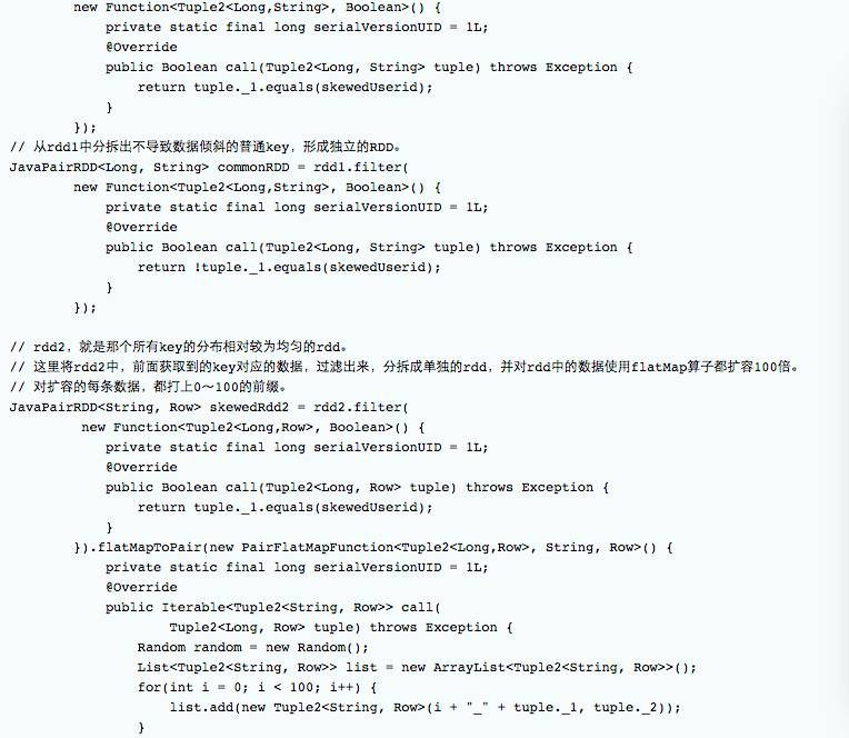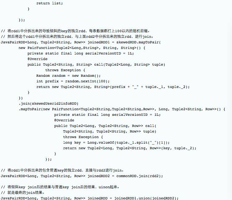 方案适用场景:两个RDD/Hive表进行join的时候,如果数据量都比较大,无法采用“解决方案五”,那么此时可以看一下两个RDD/Hive表中的key分布情况。如果出现数据倾斜,是因为其中某一个RDD/Hive表中的少数几个key的数据量过大,而另一个RDD/Hive表中的所有key都分布比较均匀,那么采用这个解决方案是比较合适的。