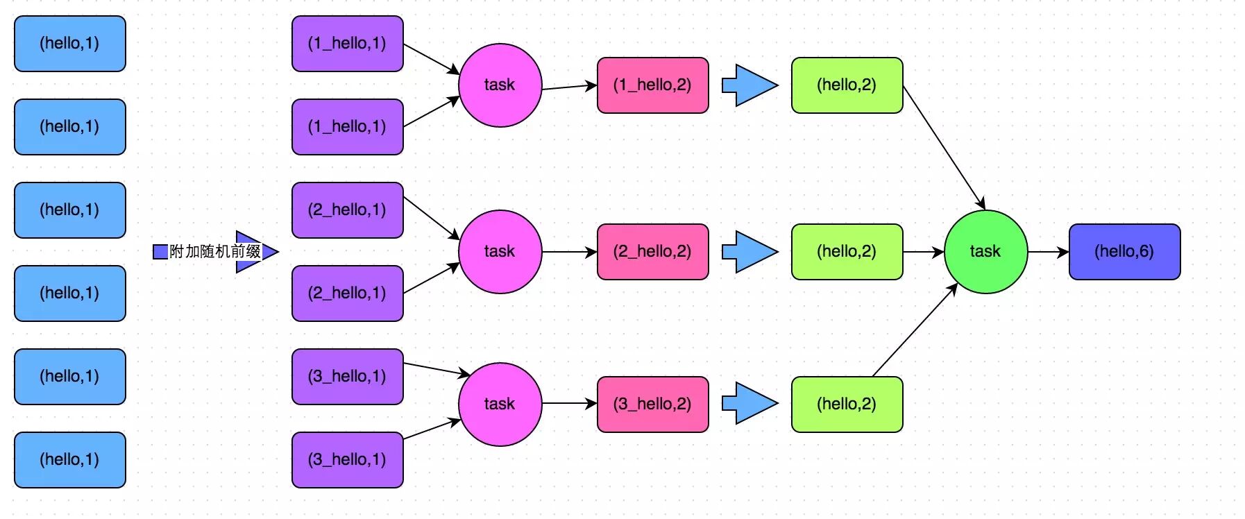 方案实现原理:将原本相同的key通过附加随机前缀的方式,变成多个不同的key,就可以让原本被一个task处理的数据分散到多个task上去做局部聚合,进而解决单个task处理数据量过多的问题。接着去除掉随机前缀,再次进行全局聚合,就可以得到最终的结果。具体原理见下图。