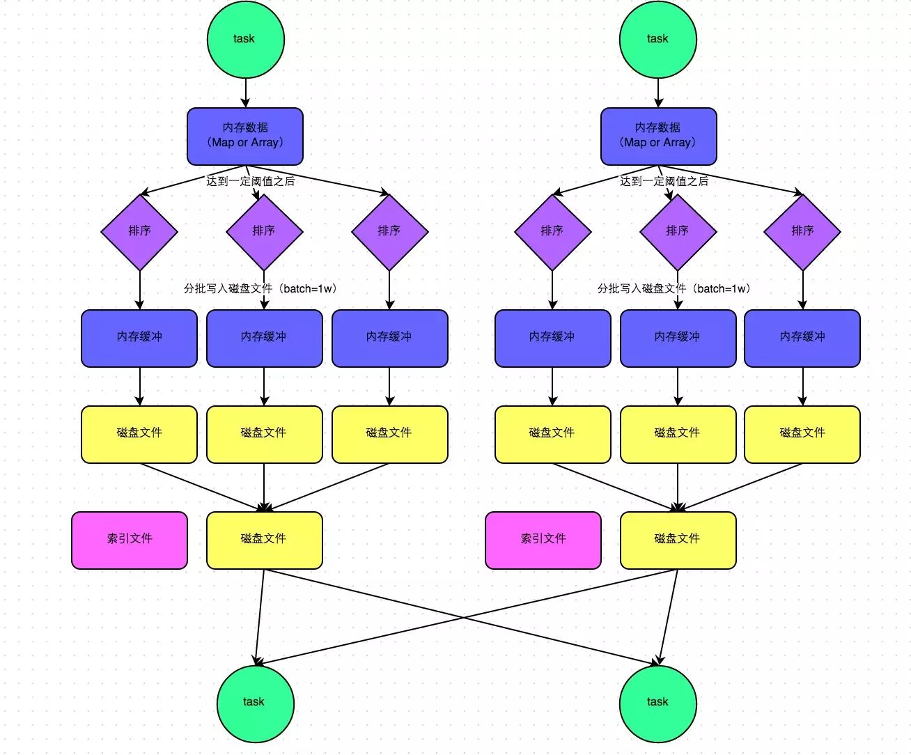 一个task将所有数据写入内存数据结构的过程中,会发生多次磁盘溢写操作,也就会产生多个临时文件。最后会将之前所有的临时磁盘文件都进行合并,这就是merge过程,此时会将之前所有临时磁盘文件中的数据读取出来,然后依次写入最终的磁盘文件之中。此外,由于一个task就只对应一个磁盘文件,也就意味着该task为下游stage的task准备的数据都在这一个文件中,因此还会单独写一份索引文件,其中标识了下游各个task的数据在文件中的start offset与end offset。